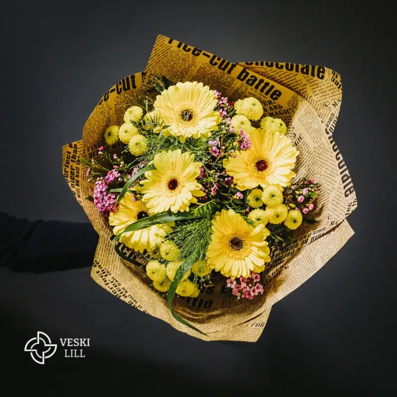 Kaunis päev on lillekimp, täiuslik kooslus kollastest lilledest ja kimburohelisest – ühtaegu üllatav ja harmoneeruv, kindlasti aga saaja meelt rõõmustav lillekimp!