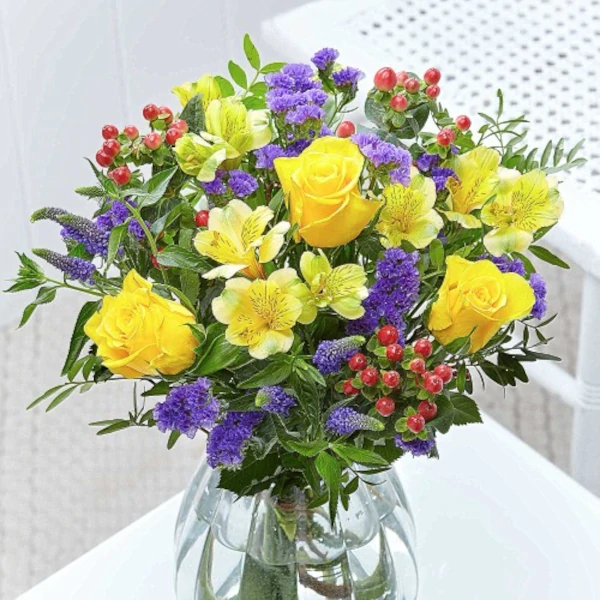 Kaunilt päikeseline lillekimp kollastest roosidest,kollastest inkaliiliatest,lillast parkjuurest,naistepunast ja kombineeritud kimburohelisega.