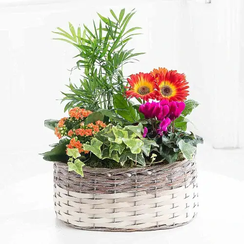 Toalilled oranž kalanhoe, oranž gerbera , hedera , roosa alpikann ja kuldviljakpalm korvis.